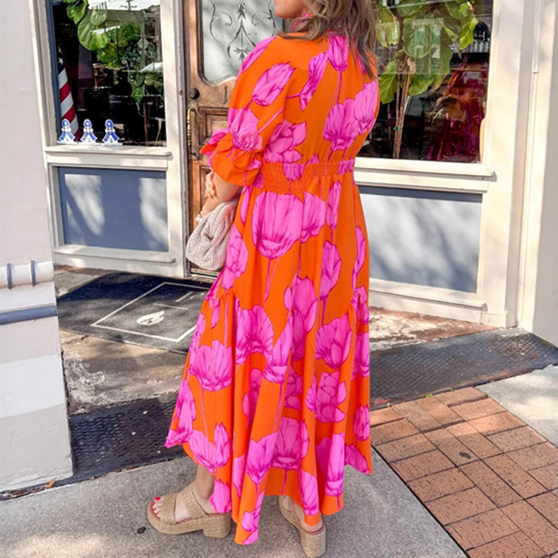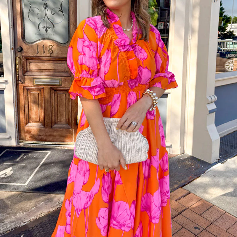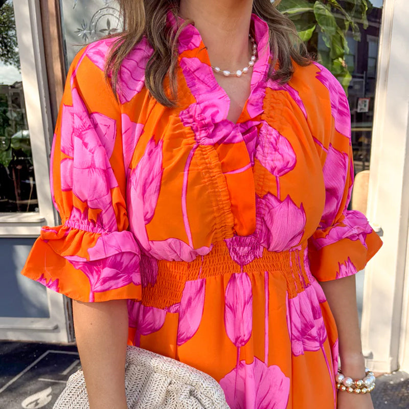 VIBRANT FLORAL LOOK - Den levande orange basen och det iögonfallande rosa blommiga trycket ger omedelbart energi till din garderob. Det är en look som sticker ut och ger ljusstyrka och självförtroende till dag- eller kvällsevenemang - utan att vara överdriven. Designad för att väcka uppmärksamhet av alla de rätta anledningarna.